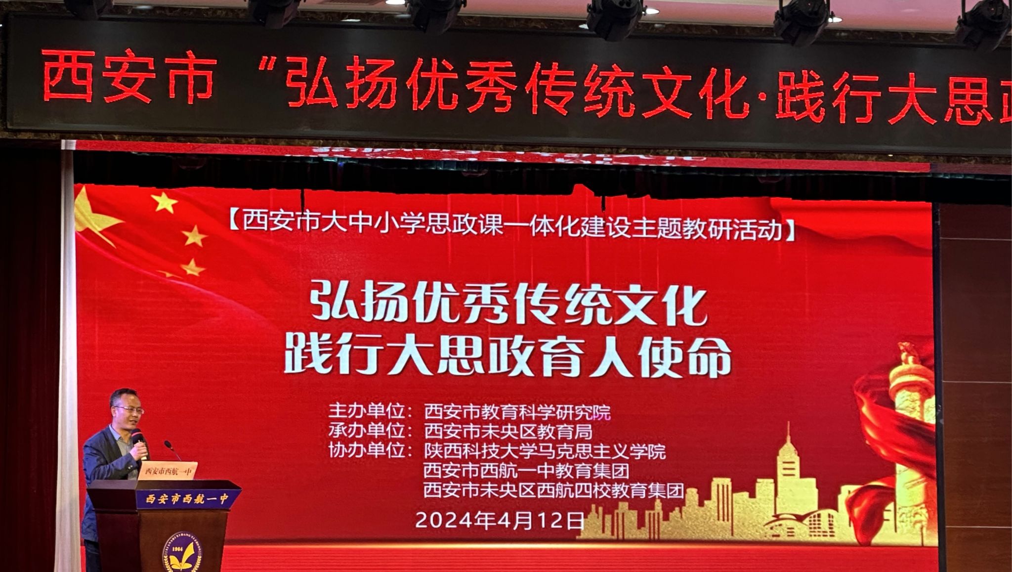 为深入落实立德树人根本任务,将优秀传统文化融入到大思政教育中,引导小学、中学、大学的学生们树立正确的世界观、人生观和价值观,增强文化自信和国家认同感。2024年4月12日下午,由西安市教育科学研究院主办,西安市未央区教育局承办,陕西科技大学德赢vwin体育官网登录、西安市西航一中教育集团、西安市未央区西航四校教育集团协办的“弘扬优秀传统文化·践行大思政育人使命”主题教研活动在西安市西航一中成功举办。