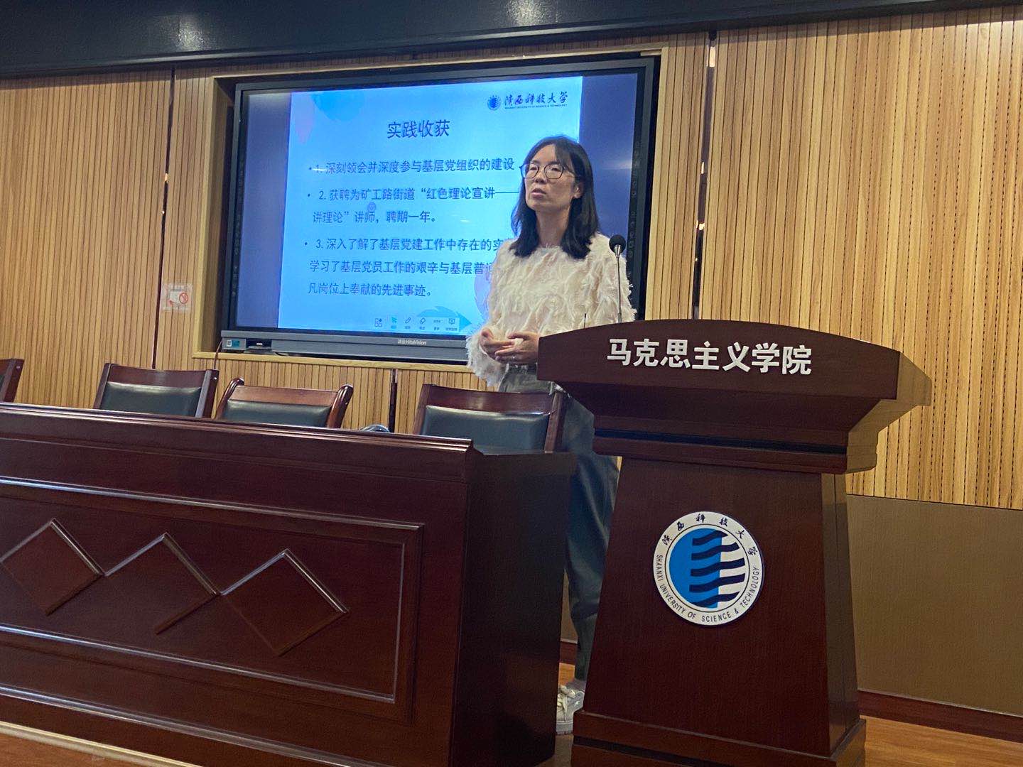 青年教师李璐、师俊华分别从实践基本情况、具体工作、收获总结等三个方面,介绍了她们在西北化工研究院和河南省平顶山市新华区矿工路街道办事处,为期一个月的社会实践感想和收获。她们认为,积极参加暑期社会实践,深入一线企事业单位开展调研,是高校思政课教师服务社会、参与社会建设的表现,是马理论老师的职业使命;也是在社会实践中发现科研方向,深化自身研究内涵的重要手段。