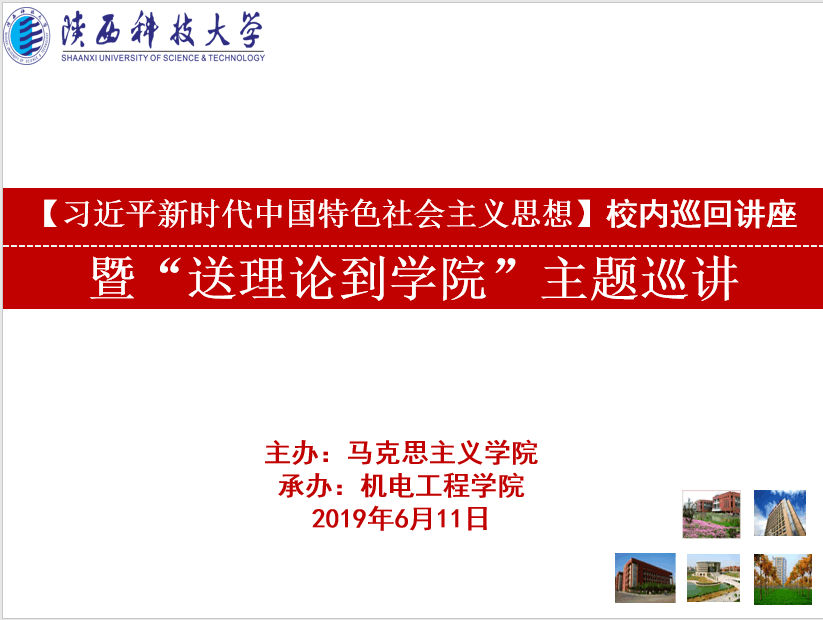 为深入贯彻习近平总书记在“学校思想政治理论课教师工作座谈会”上的讲话精神和陕西省高教工委、陕西科技大学党委关于加强高校思想政治教育工作相关文件精神,适逢全校上下喜迎“七一”建党节、喜迎新中国成立70周年的热烈氛围,陕西科技大学德赢vwin体育官网登录充分利用专业学科优势,调动优秀思想政治理论课教师资源,在全校12个学院的师生党员、入党积极分子和优秀学生骨干中,展开“习近平新时代中国特色社会主义思想”校内巡回讲座暨“送理论到学院”主题宣讲活动。